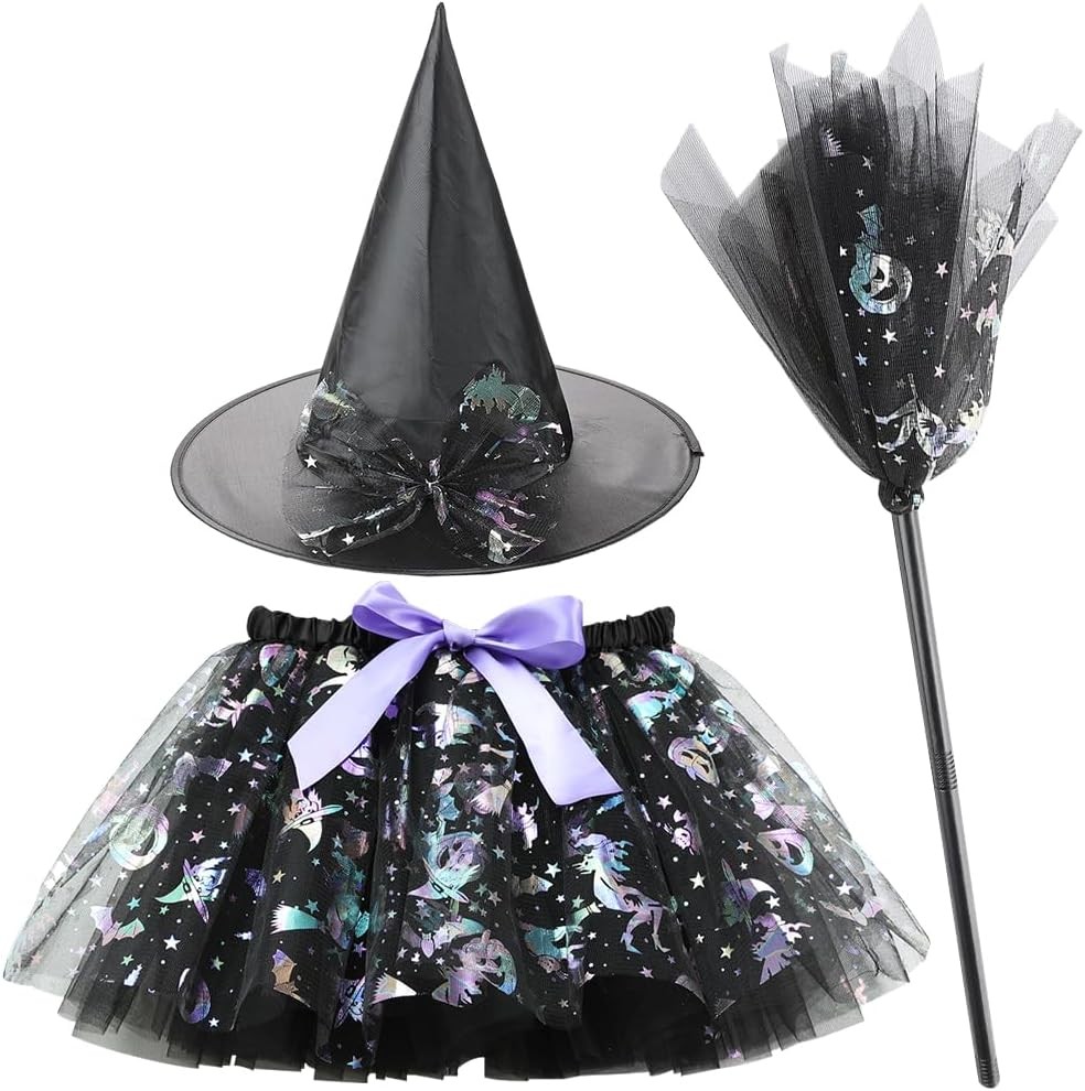 WFKKMEQ Witch Costume, Halloween TuTu Skirt Suit Costumes Set with Witch Hat Tutu Skirt Broom Magic Fancy Dress Cosplay Outfit Accessories for Kids Halloween Carnival Party Dress up Cosplay (Black)