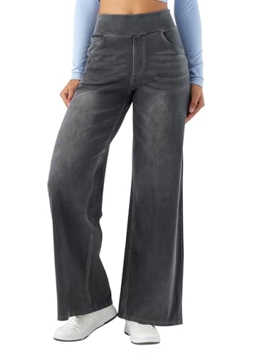 SotRong Elastic Pull on Wide Leg Jeans for Women UK High Waisted Stretchy Baggy Trendy Tummy Control Straight Leg Jeans Soft Loose Flared Plazzo Denim Pants with Pockets Medium Grey XS