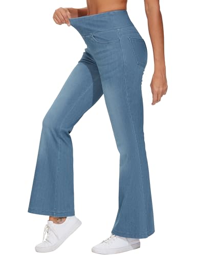 THE GYM PEOPLE Women's Wide Leg Trousers High Waisted Stretchy Tummy Control Flared Jeans Pull on Bell Bottom Jeggings with Pockets Denim Blue