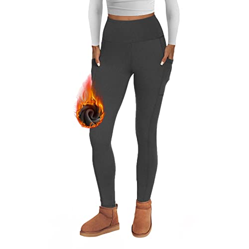 AMIYOYO Thermal Leggings Women with Pockets High Waist Fleece Lined Leggings Warm Winter Fur Yoga Pants Tummy Control Trousers Soft Stretchy Tights Workout Yoga Gym Running Dark Gray