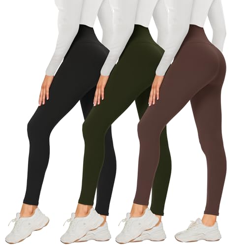 DDOBB 3 Pack Leggings for Women High Waisted Black Leggings Tummy Control Stretchy Pants Trousers for Gym Fitness Yoga Running Regular&Plus Size(Black + Army Green + Brown)