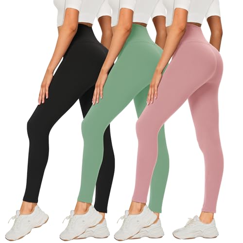 DDOBB 3 Pack Leggings for Women High Waisted Black Leggings Tummy Control Stretchy Pants Trousers for Gym Fitness Yoga Running Regular&Plus Size(Black + Green + Morandi Pink)