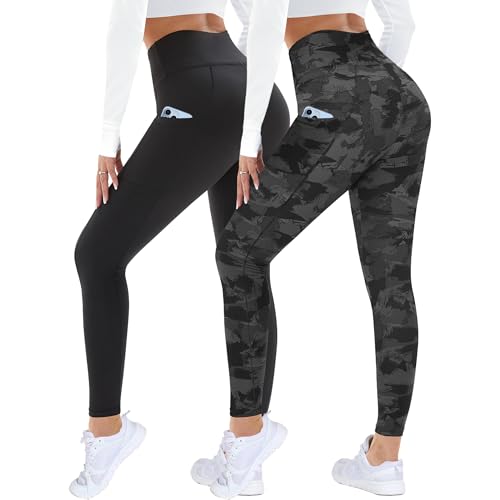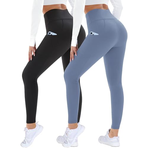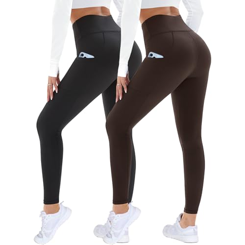 DDOBB 2 Pack Leggings for Women High Waisted Black Gym Leggings with Pockets Tummy Control Stretchy Pants Trousers for Fitness Yoga Running Regular Plus Size(Black*2 S-M)