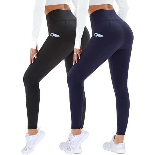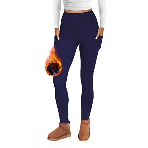AMIYOYO Thermal Leggings Women with Pockets High Waist Fleece Lined Leggings Warm Winter Fur Yoga Pants Tummy Control Trousers Soft Stretchy Tights Workout Yoga Gym Running Navy
