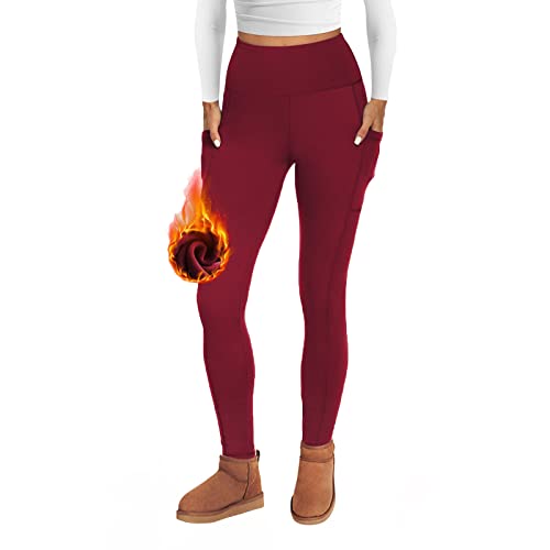 AMIYOYO Thermal Leggings Women with Pockets High Waist Fleece Lined Leggings Warm Winter Fur Yoga Pants Tummy Control Trousers Soft Stretchy Tights Workout Yoga Gym Running Burgundy