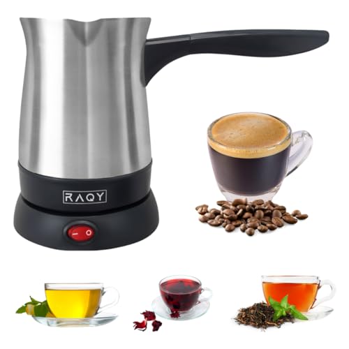 RAQY Electric Coffee Pot, Turkish Greek Coffee Maker, Stainless Steel, Rotational base, Capacity 250ml up to 500 ml, 800 W Power, Coffee, Espresso, Milk, Hot Chocolate, Portable Travel Stainless