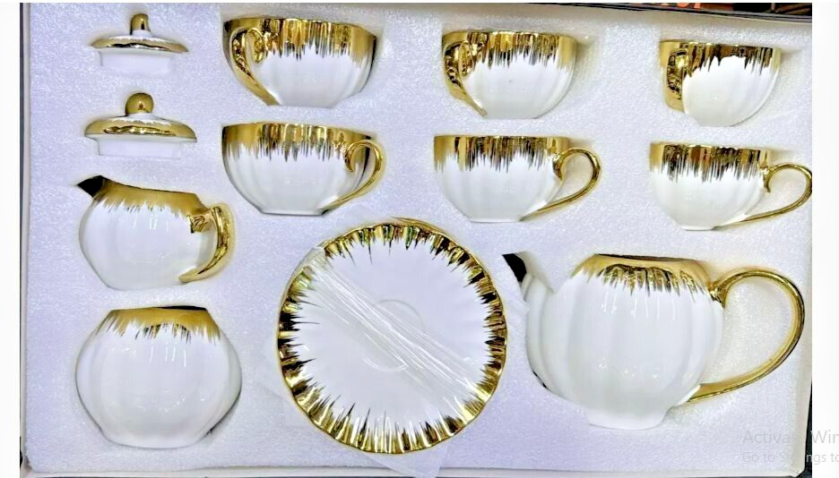 Turkish Tea Set Cups Saucer Teapot Sugar Pot Creamer 15pcs White Gold Gift