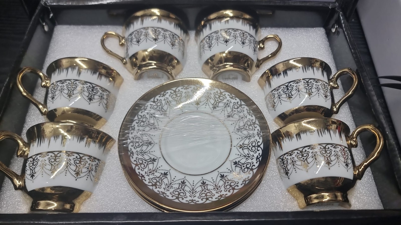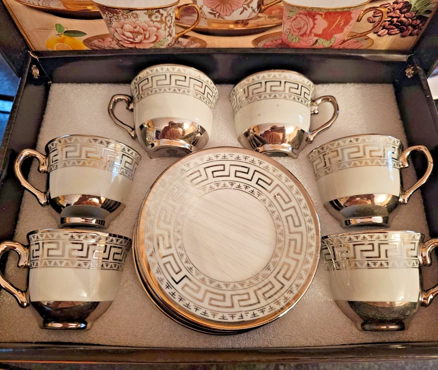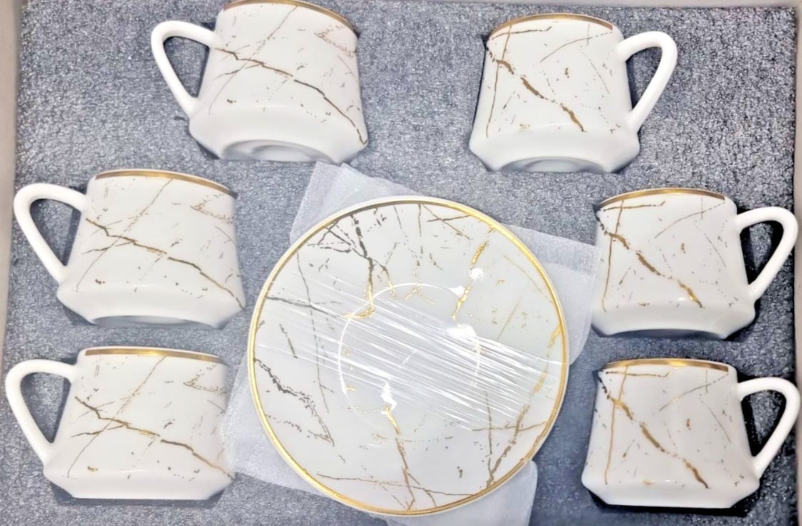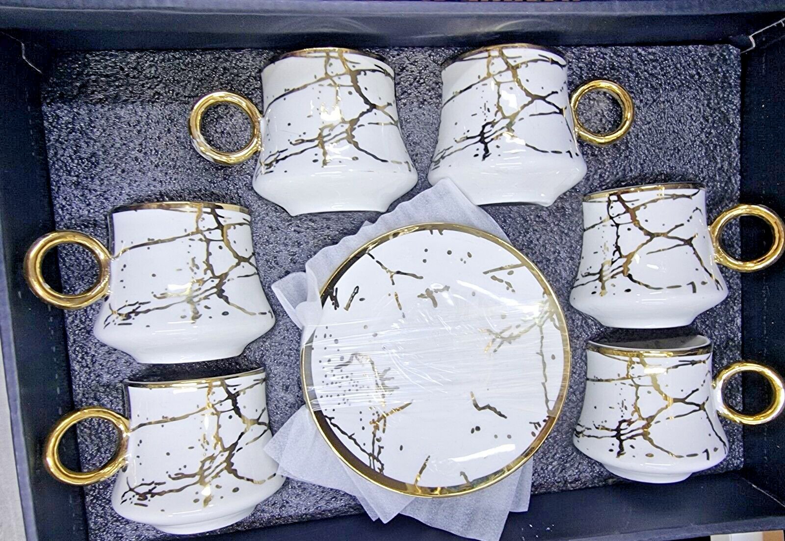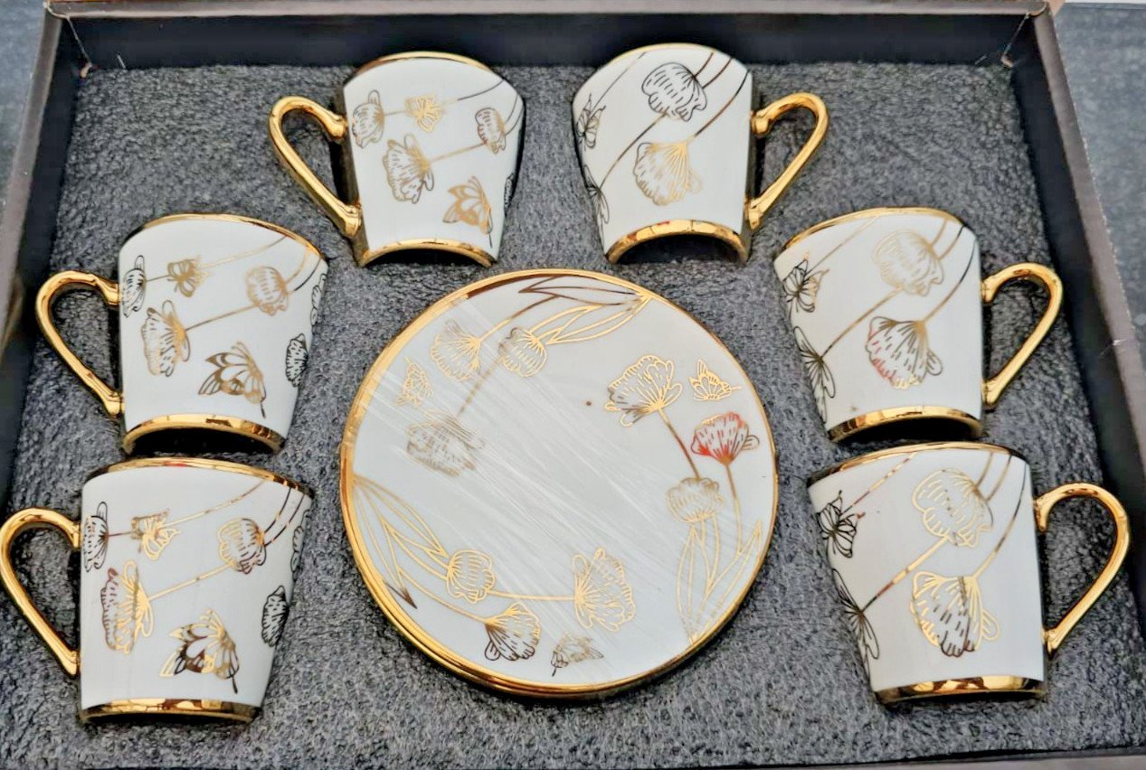 Stunning Turkish Tea Set of 6 White Gold Cups & Saucer Coffee Gift