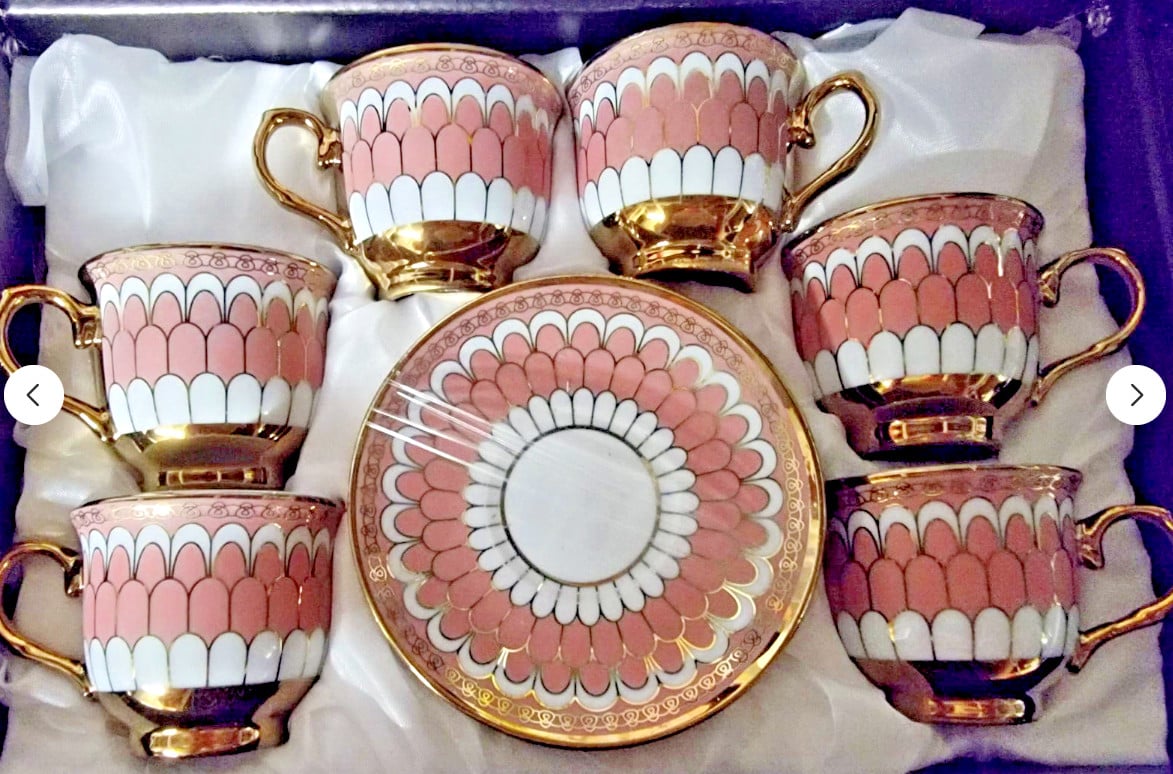Stunning Turkish Tea Set of 6 Pink Gold Cups & Saucer Coffee Gift