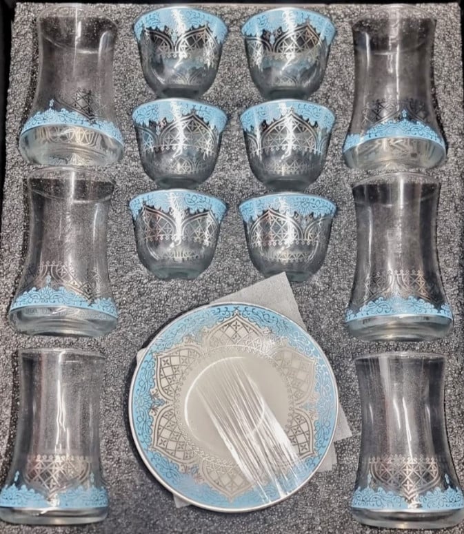 Turkish Arabic Tea Set of 16pcs Glass Kahwa Cups & Saucer Shai Coffee Blue Gift