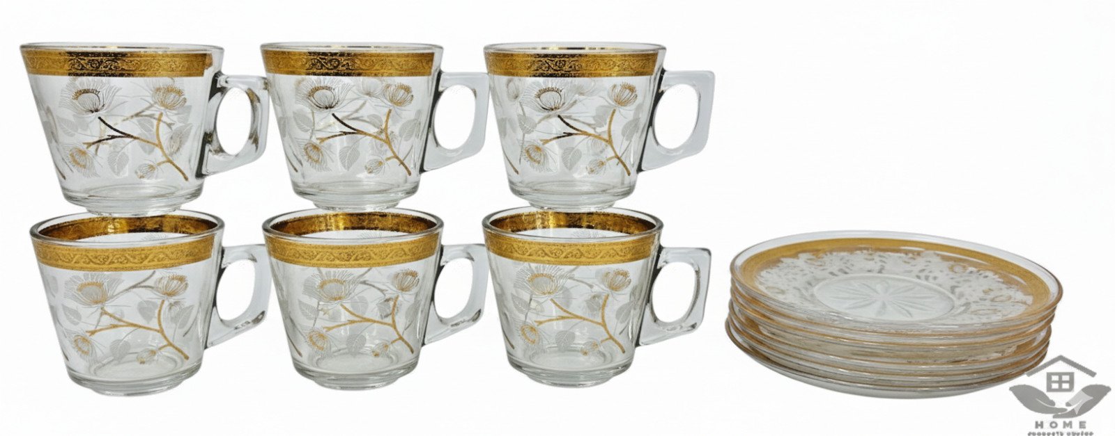 Turkish Glass Tea Set of 6 Cups With Saucer Floral Gold Gift