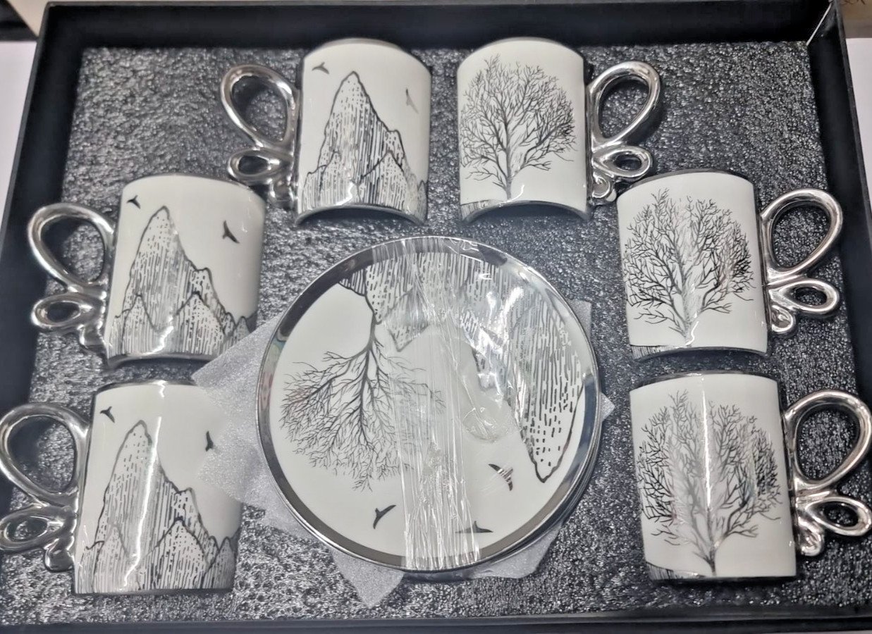 Stunning Turkish Tea Set of 6 White Silver Cups & Saucer Coffee Gift