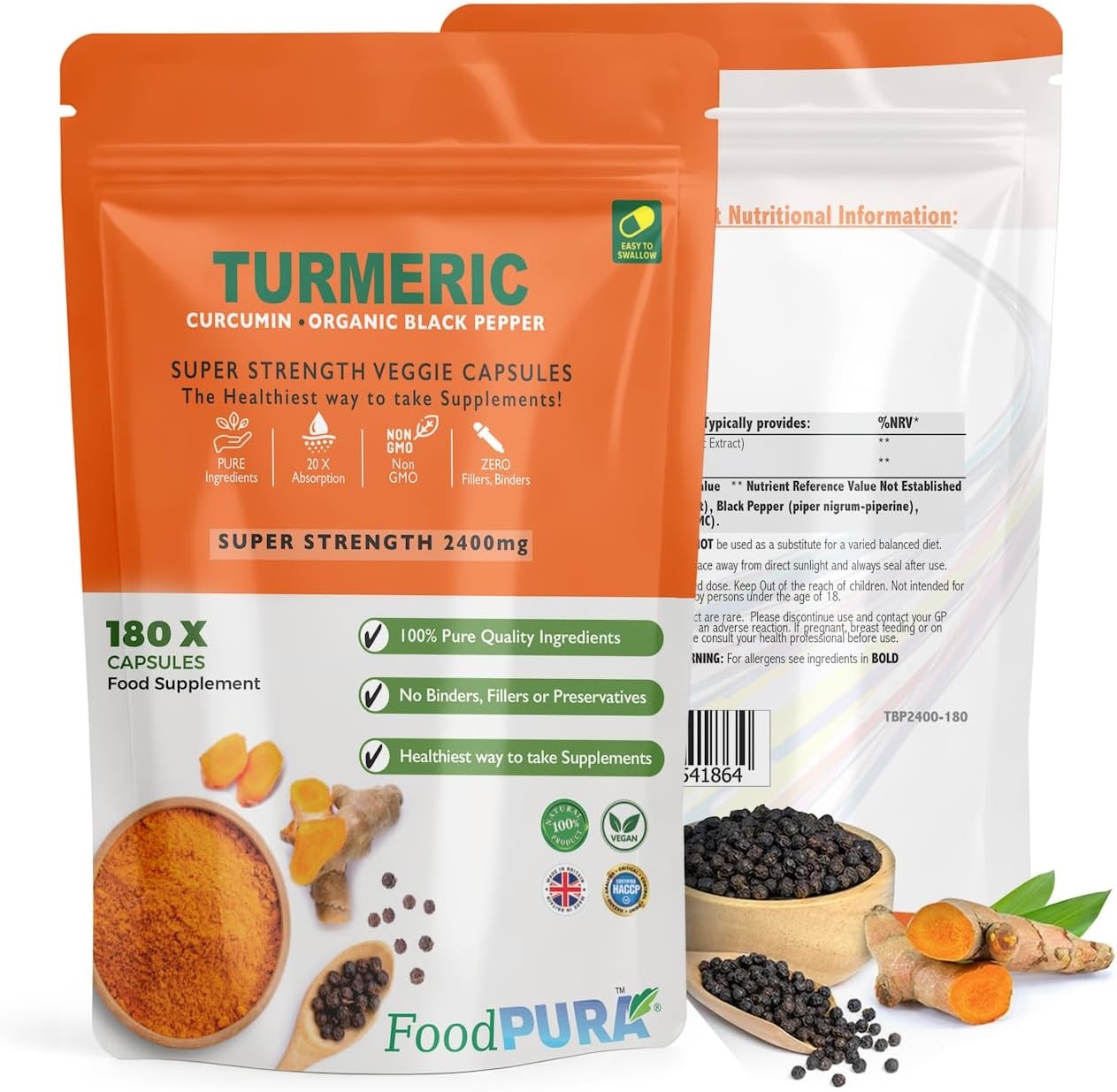 FoodPURA 180 X Turmeric with Black Pepper Capsules High 180 count (Pack of 1)