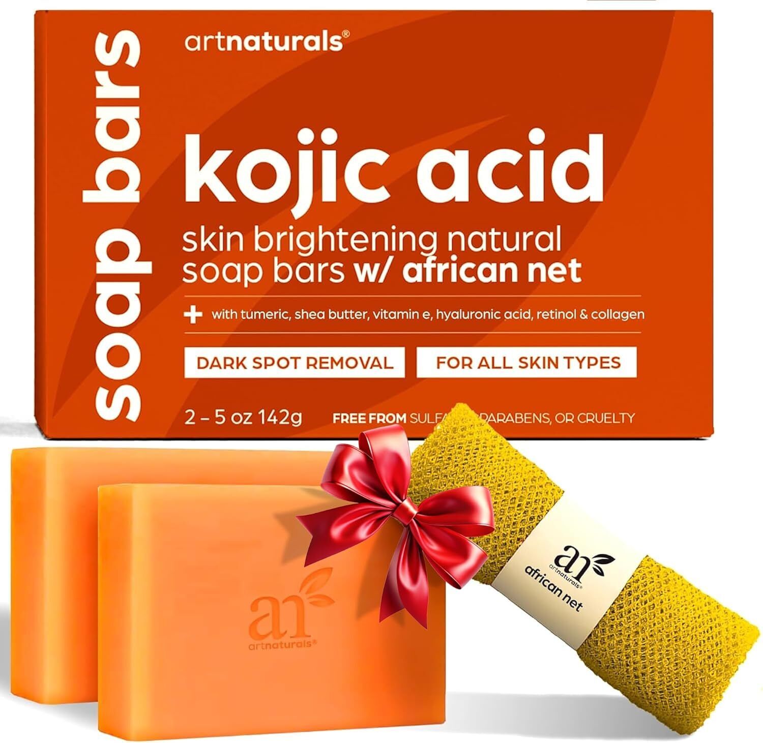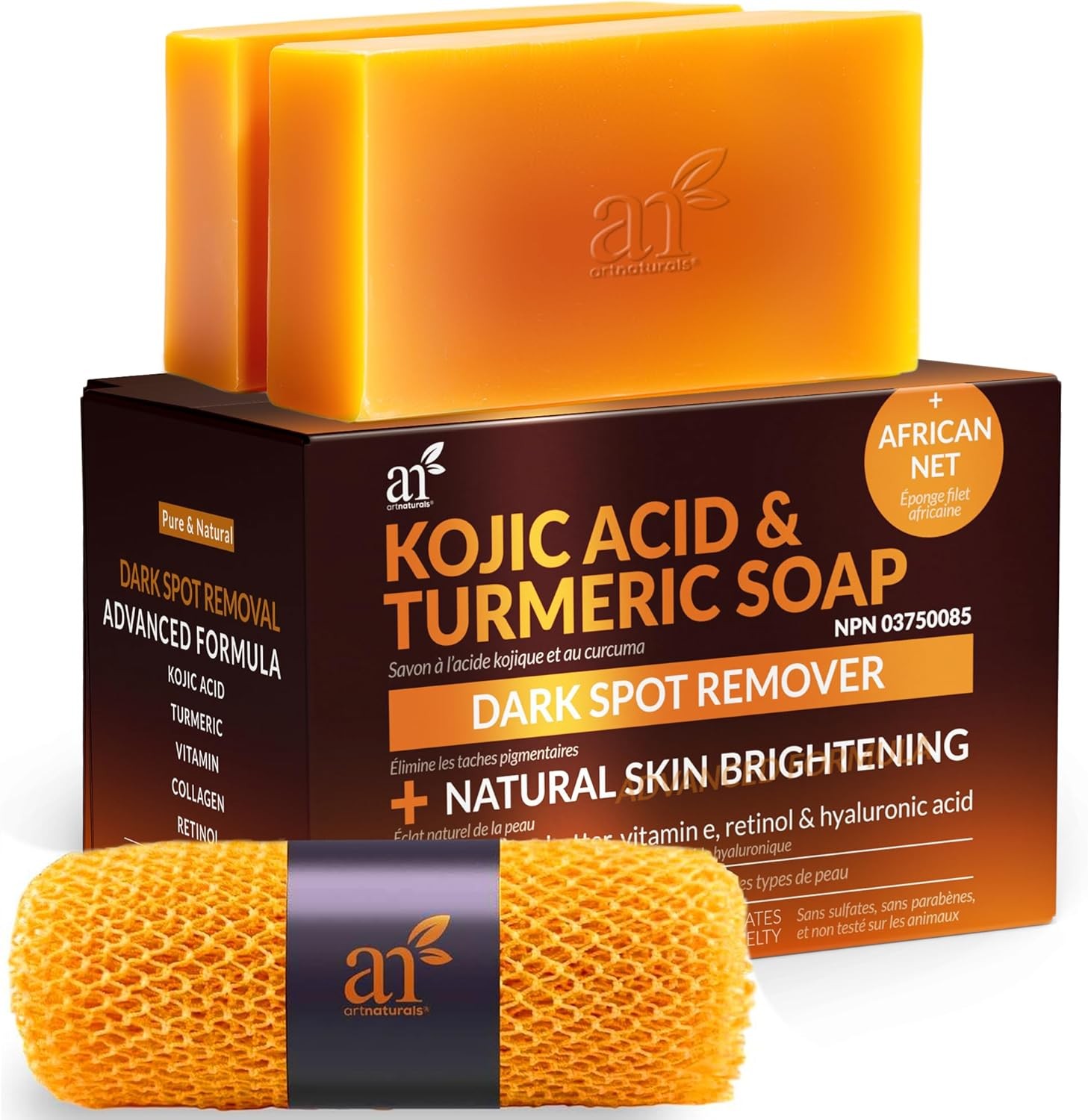 Kojic Acid Soap + African Net Sponge (2 pack X 142g Turmeric bars) Dark spot remover, Hyperpigmentation & Scars - Original Japanese Complex Vitamin C, Hyaluronic Acid, retinol, shea butter (Citrus)
