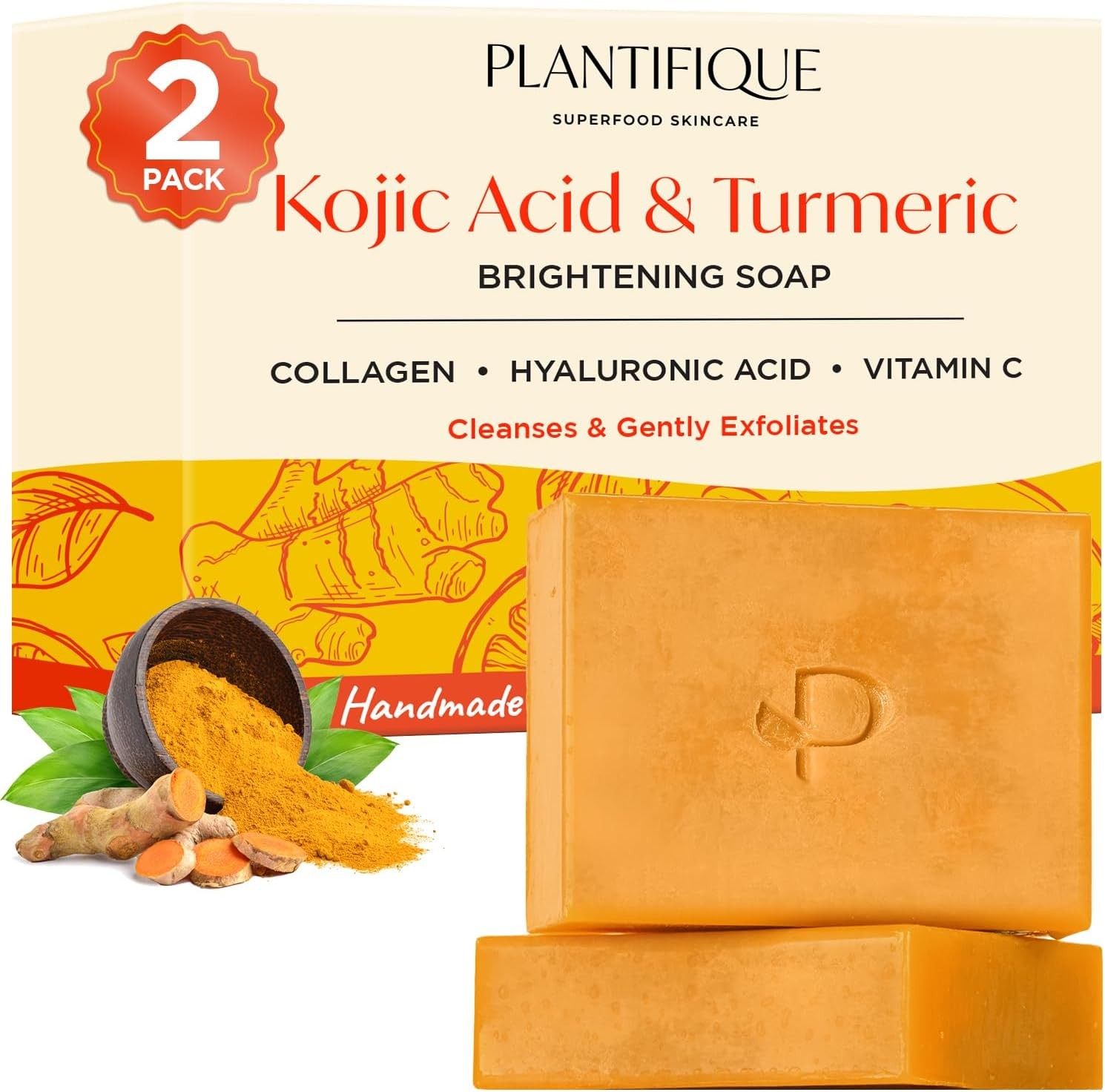 PLANTIFIQUE Kojic Acid Soap for Hyperpigmentation, Turmeric Soap 2 Bars, Hyaluronic Acid, Collagen, Vitamin C, Face Wash, 160g