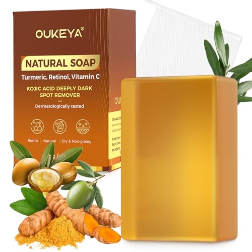 OUKEYA Kojic Acid & Turmeric Soap for Face & Body, Dark Spot Remover, Fades Acne Scars & Spots, Brightening & Moisturizing with Vitamin C, Retinol & Hyaluronic Acid, Shea Butter, with Net