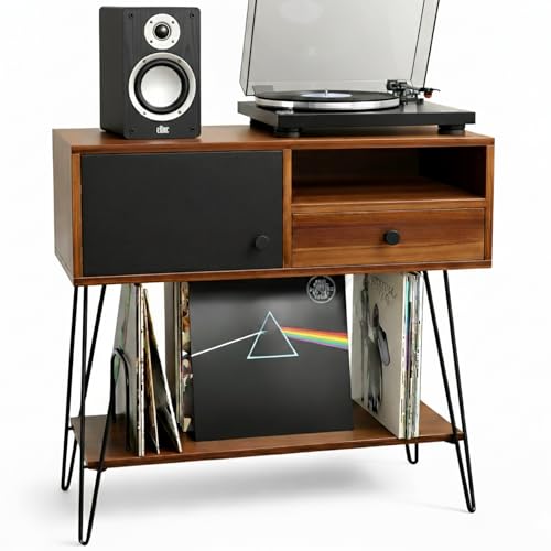 Large Mid Century Modern Record Player Stand with Vinyl Storage Holds Up to 200 Albums - Walnut Console Table for Turntables, Living Room, and Entryway | Record Player Table