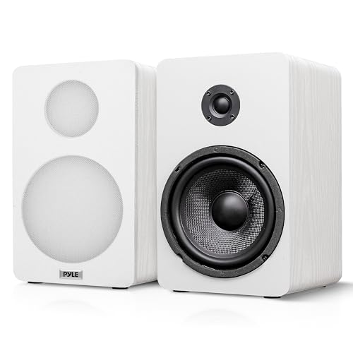 Pyle Bookshelf Speakers Passive Hi-Fi – 13cm Stereo Speakers with Wall Mount Brackets, 200W Max Power, RCA Input, Paper Cone Woofer, Soft Dome Tweeter, For Turntables, Vinyl, DJ & Home Audio, WhiteF