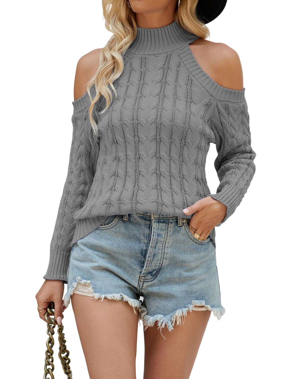 Womens Cold Shoulder Turtle-Neck Sweaters Fall Long Sleeve Soft Cable Knit4437