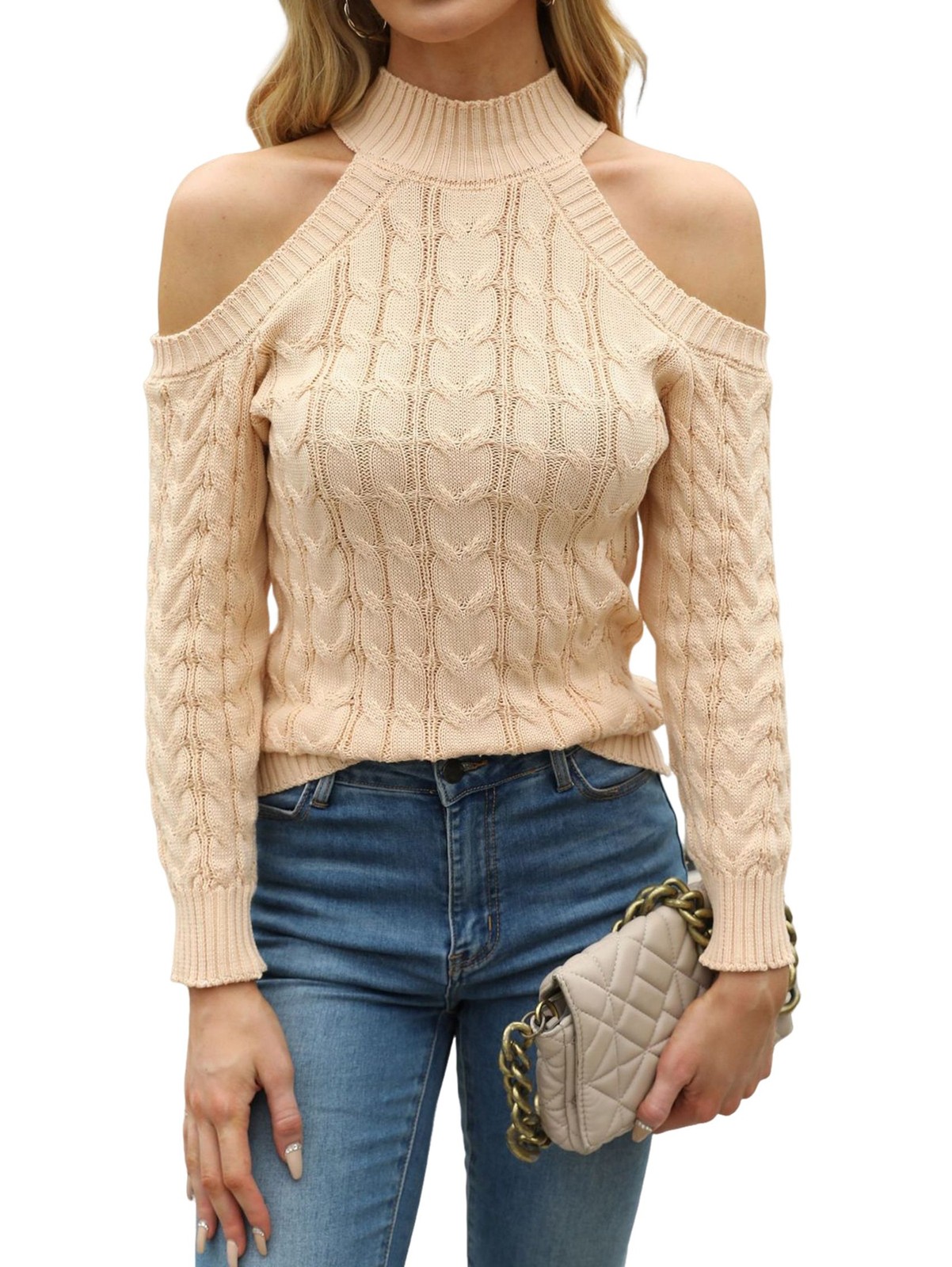 Womens Cold Shoulder Turtle-Neck Sweaters Fall Long Sleeve Soft Cable Knit3385