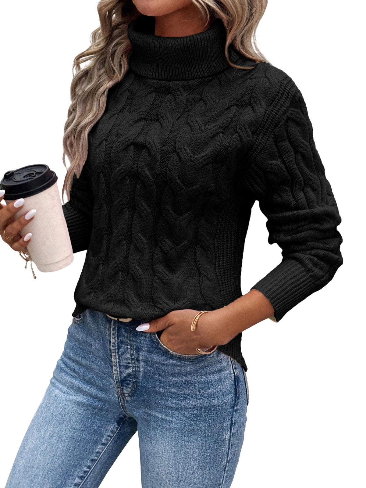 Womens Cold Shoulder Turtle-Neck Sweaters Fall Long Sleeve Soft Cable Knit9211