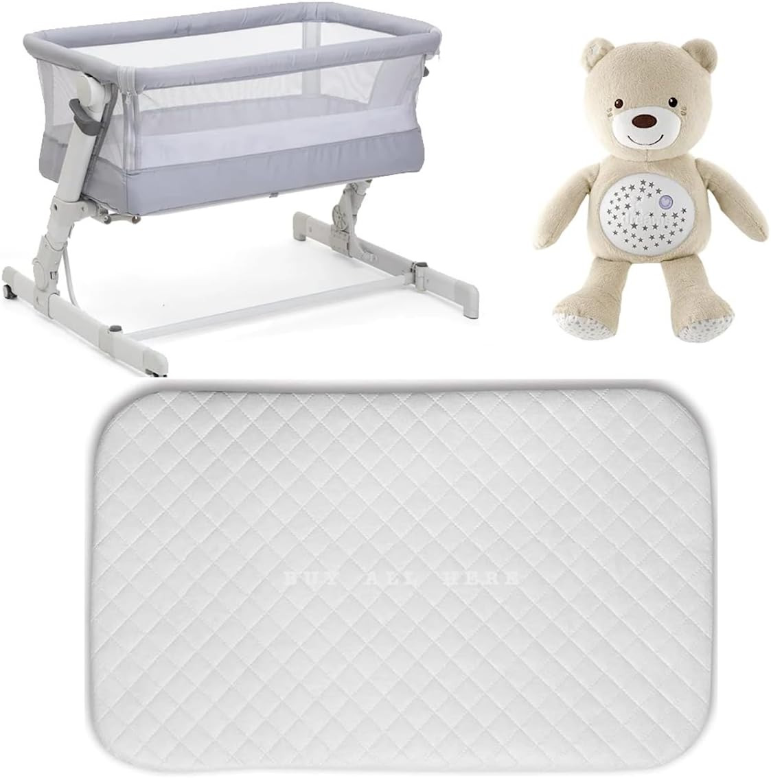 Tutti Bambini CoZee® Air Crib Bundle - Bedside Crib with 2 Crib Sheets, Mattress Protector, and Mattress Included - Grey/Cloud sheets, Waterproof Protector