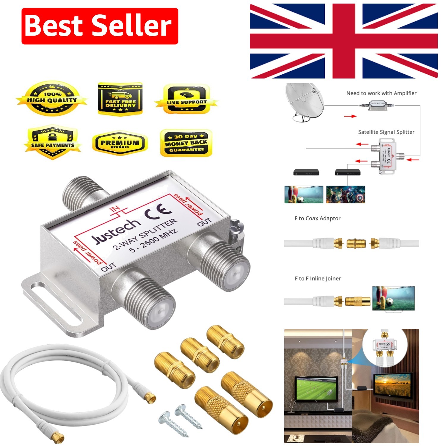 2 Way Satellite Splitter TV Aerial Splitter 5-2500Mhz with 2 * 1.5M Coax Cable F