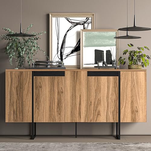 OPODEE Modern TV stand cabinet and tv unit for living room media set-ups, 180 x 40 x 40.5 cm Wood media cabinet with 4 doors, soft-close hinges, aluminium handles and iron legs
