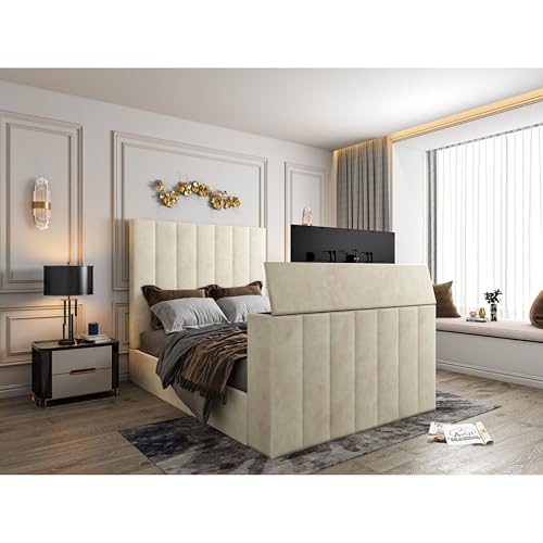 ark future Empress TV Bed with Built-In TV Storage – Luxury Frame with Remote Lift Mechanism – Premium Upholstered Bed (Mattress not included) (Cream Plush Velvet, 4.6FT Double)