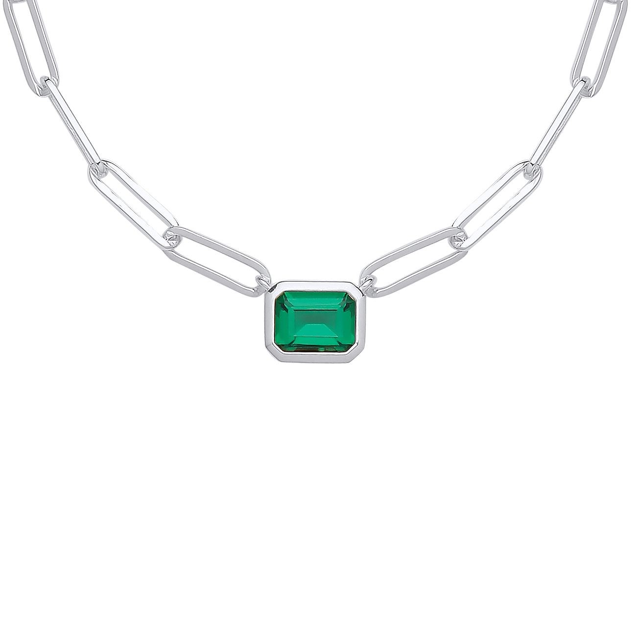 Silver Jewelco London Green Emerald CZ Paperclip TV Bezel Shape Necklace 3mm 18"