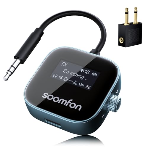 SOOMFON Bluetooth 5.3 Transmitter Receiver with 3.5mm Jack with LCD Screen, Dual Pairing,13H Playtime AUX Bluetooth Adapter, 2-in-1 Wireless Audio Transmitter for Airplane TV Headphones Speakers