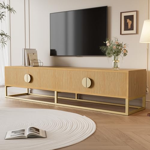 TV Stand Cabinet for 65 Inch TVs, Modern TV Unit with 2 Storage Cabinet, Entertainment Console Table with 4 Doors with Semi-Circular Handles and Metal Base Legs for Living Room, Bedroom, Wood Grain