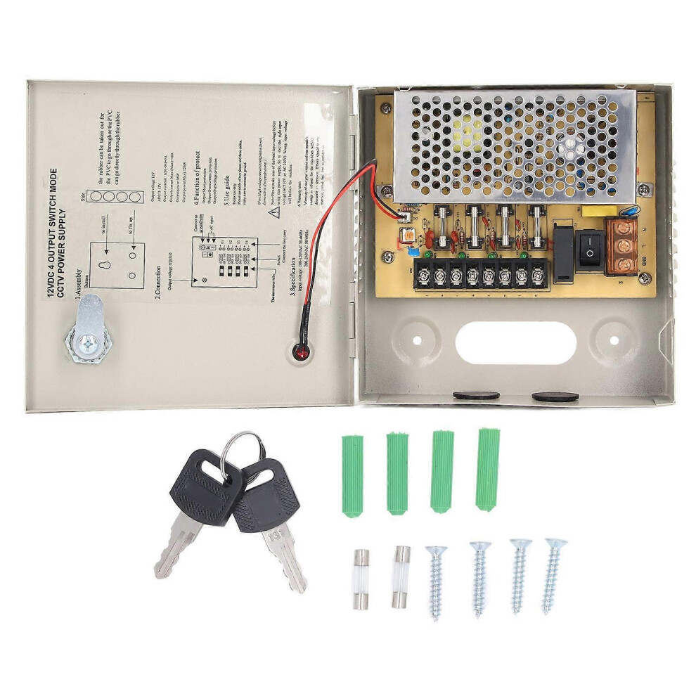 (As show, One size) 4 Channel 12V CCTV Power Supply 3A Fuse Closed Circuit TV Power Supply with Metal Box Lock 110V 220V