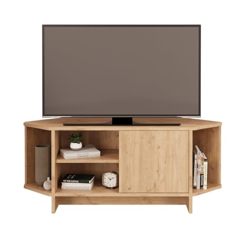 Bimossa Teo Corner TV Stand – Space-Saving TV Unit for 43–48'' TVs, Compact Media Console with Open Shelves & Cabinet, Ready to Assemble, Available in 5 Colours (Oak)