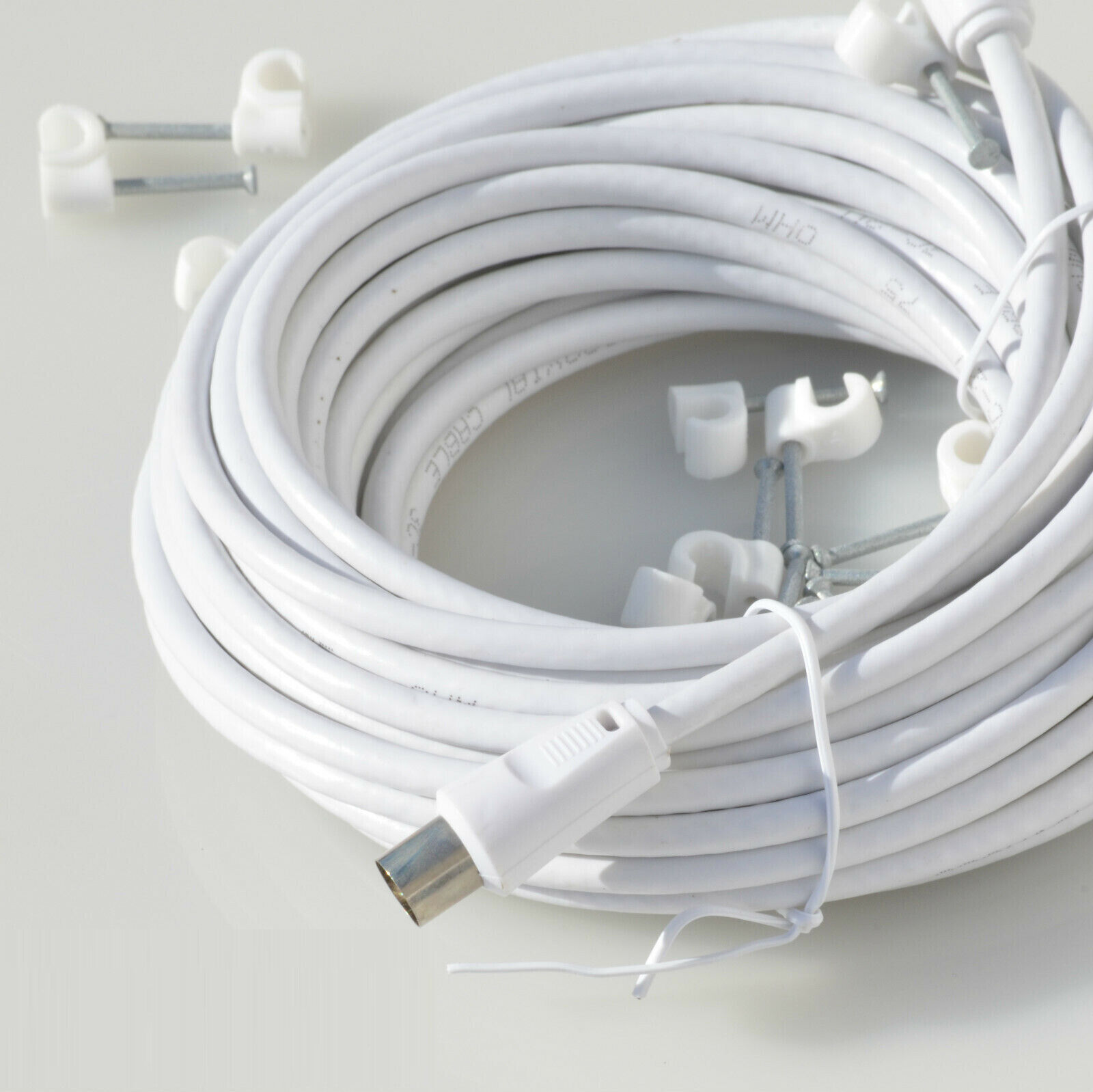 Brand New 20m White Male Tv Coax Cable For Sky + HD Magic Eye TV Link Plus Clips