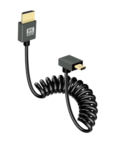 GELRHONR Coiled Micro HDMI to HDMI Cable Short, 8K@60Hz Micro HDMI Cable Male to Male Spring Flexible Slim Cord 48Gbps High Speed Support 3D, for Camera Video Capture Card,TV (Up Angle)
