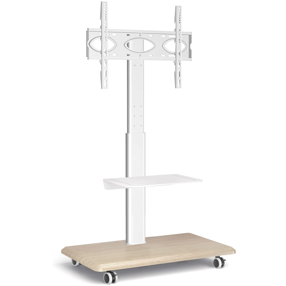 FITUEYES White TV Stand on Wheels with Wood Base for 32-70 Inch, 60 Swivel & 6 Height Adjustable Mobile TV Stand Trolley, Tall TV Floor Stand with 2