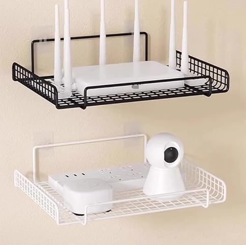 AugustknowU Wall Mounted Router Shelf with No Drill Installation, Stick-on Strips, and Open Mesh Design for Organizing TV Set Top Boxes and Network Devices (M White)