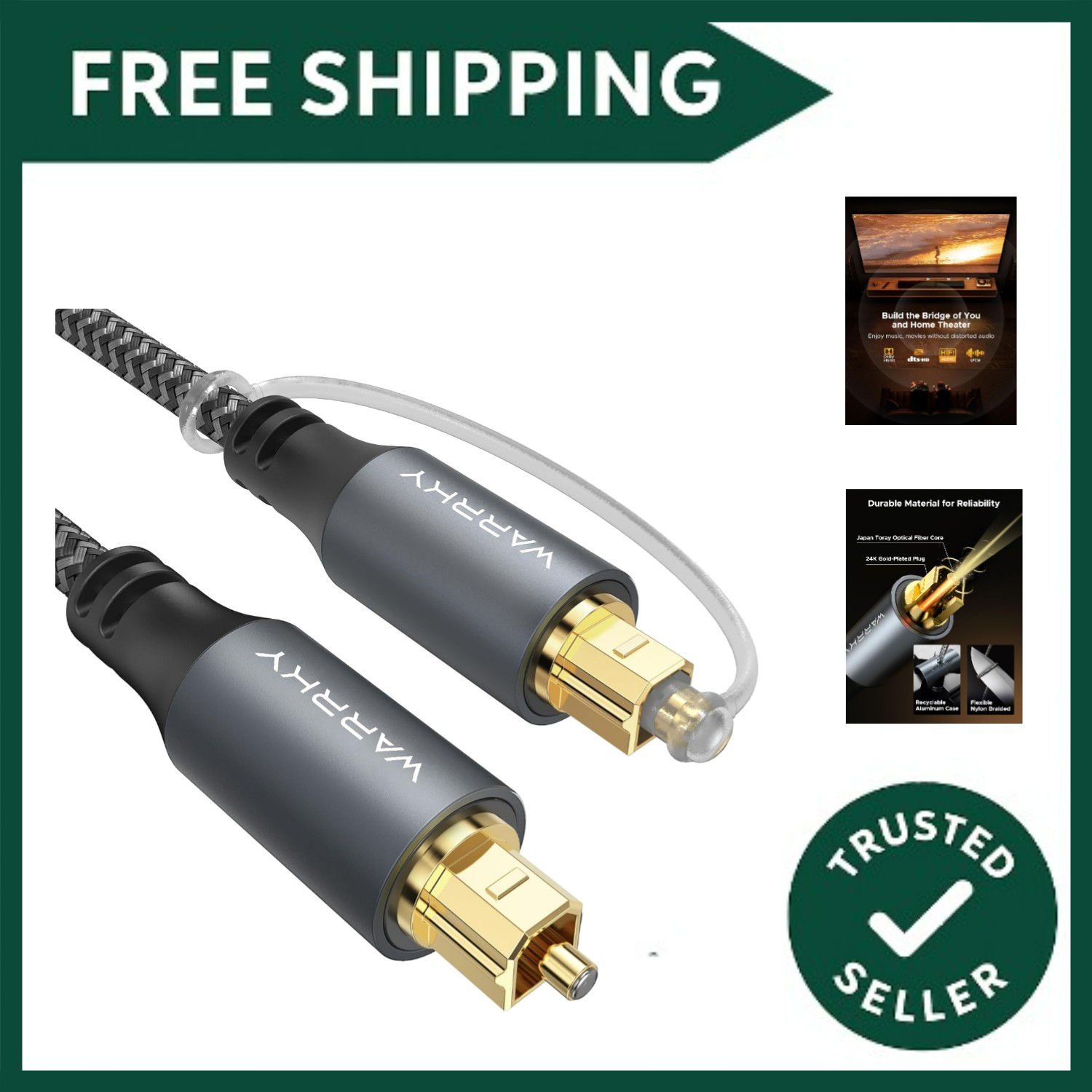 WARRKY Optical Cable for Soundbar to TV, Optical Cable, 1.8M / 6FT [Alloy Case, Nylon Braided, 24K Gold-Plated] Digital Optical Audio Cable Toslink, Compatible with Samsung, LG, Sony, Xbox etc.