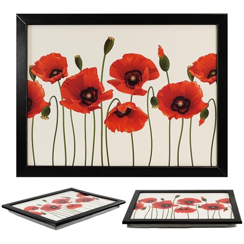The Magic Toy Shop Wooden Lap Trays with Bean Bag Cushion and Poppies Design - Large Padded Tray with Cushion for Kids and Adults - Suitable for Food, Work, Art, Studies, TV, Sofa, Bed