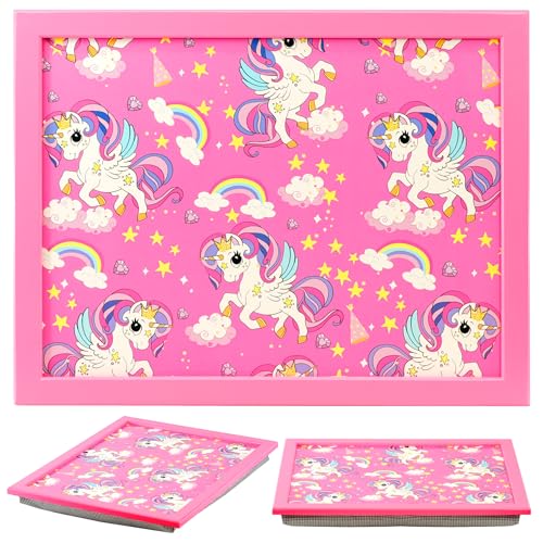 The Magic Toy Shop Wooden Lap Trays with Bean Bag Cushion - Rainbow Unicorns Design - Large Padded Tray for Kids - Suitable for Food, Art, Studies, TV, Sofa, Bed - Fantastic Gift for Girls and Boys