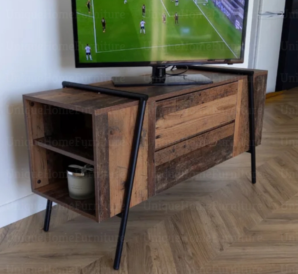 Industrial TV Stand Vintage Retro Unit Storage Media Cabinet Rustic Metal Wood