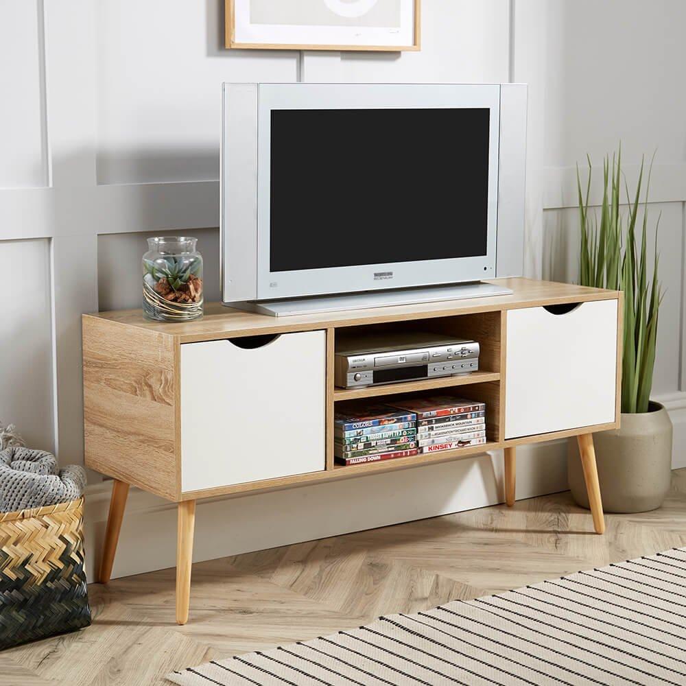 Mid Century TV Stand Entertainment Unit with 2 Doors Shelves Cable Holes 55 Inch