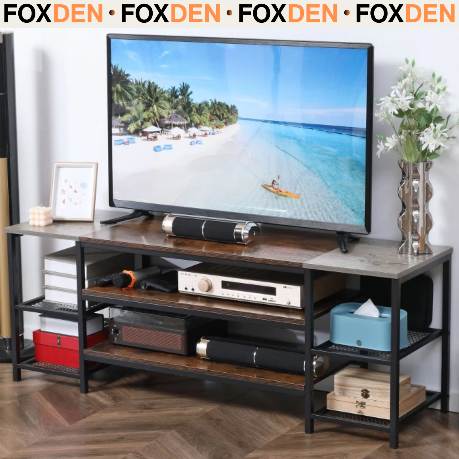 Rustic Brown TV Unit Stand Cabinet for 60 Inch TVs Metal Legs 140cm Shelves Grey
