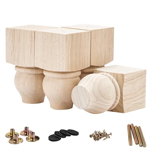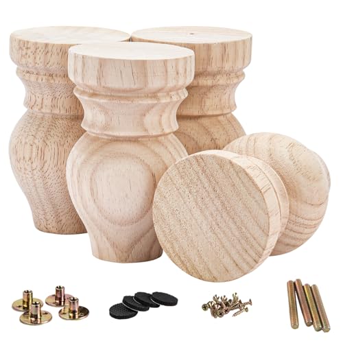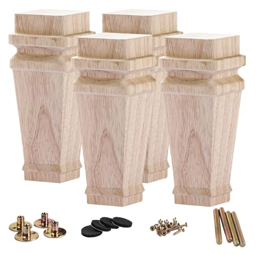 Btowin VCF 4 Inch / 10cm Wooden Furniture Legs, 4PCS Solid Wood Carved Geometry Sofa Legs Unfinished DIY Replacement Bun Feet with Mounting Plate & Screws for Sofa Cabinet Couch Table TV Stand