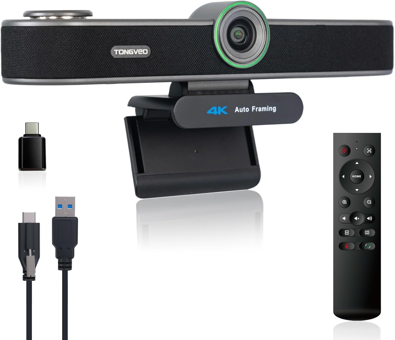 TONGVEO AI Tracking 4K Webcam 5X Zoomable for Conference TV Room System with 4 Mics and Speaker, Computer ePTZ Camera with Remote, Adjustable Wide Angle, for Laptop Mac, Video Call, Zoom