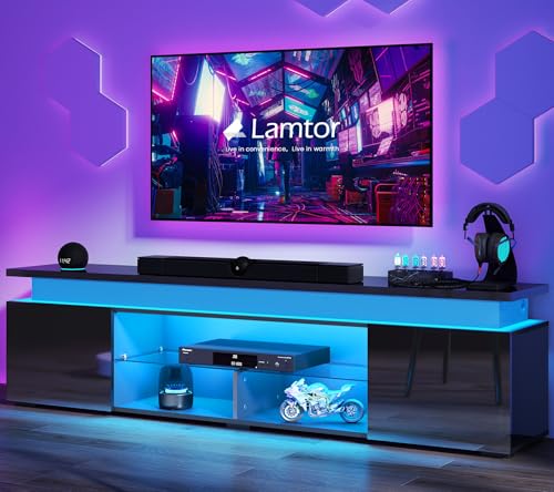 Lamtor LED TV-Stand with Power Outlet - Modern TV Stand for 85 75 65inch Televisions, Entertainment Center with Dynamic LED Lights & High Gloss, TV Midea Console for Living Room, Black