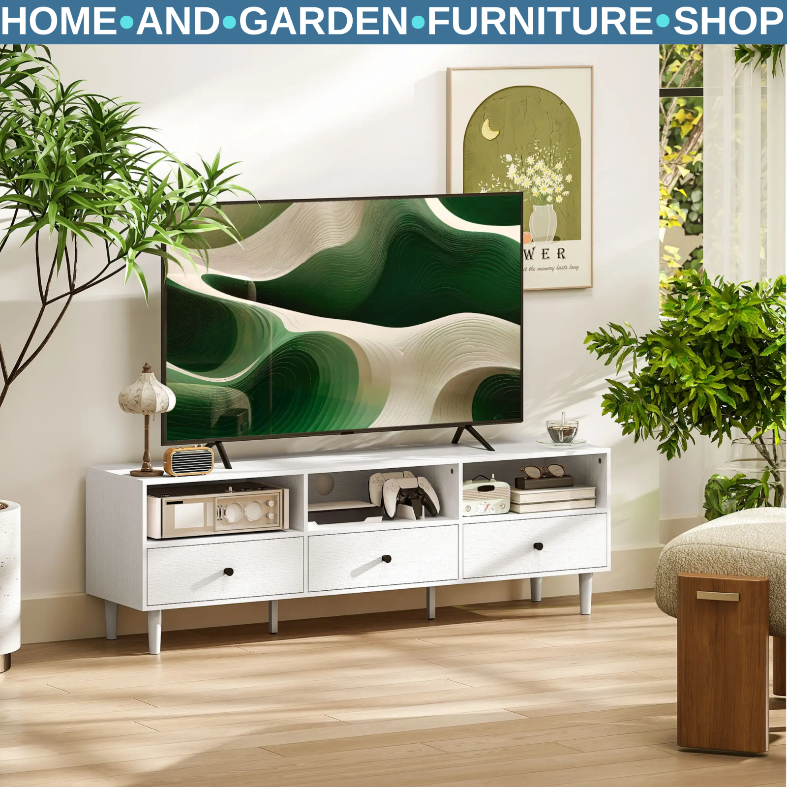 TV Unit Cabinet Stand with Drawrs Open Shelf Storage Cable Management White Wood