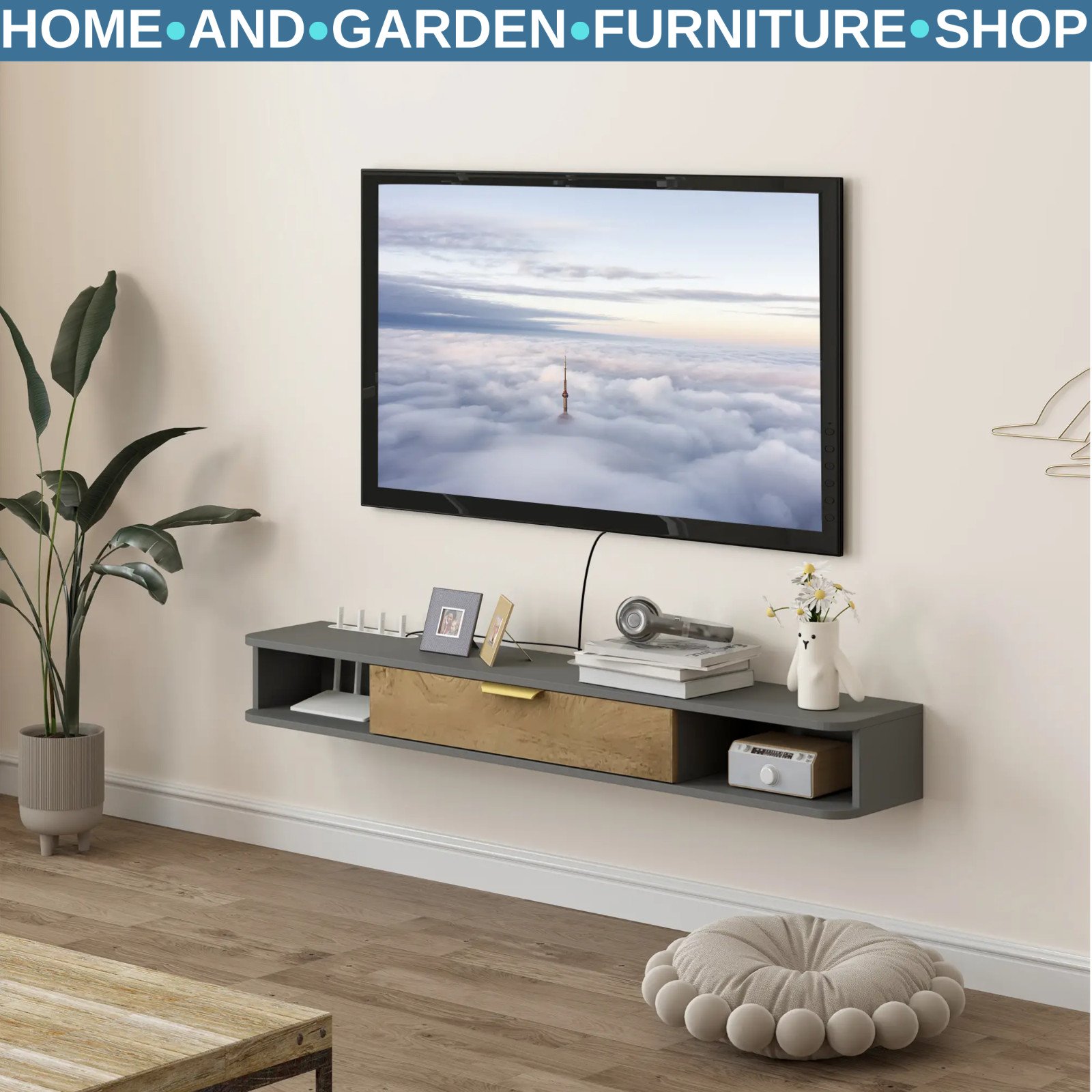 TV Stand Floating Engineered Wood Frame with Two Open Compartment Charcoal Grey