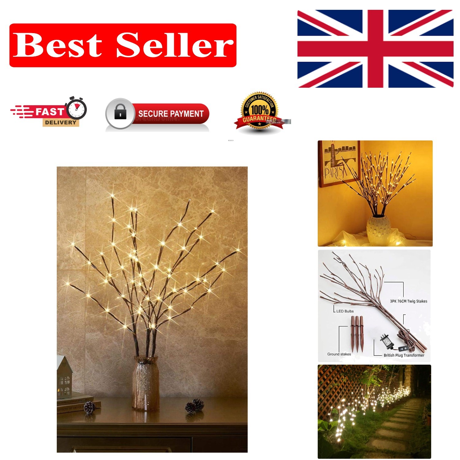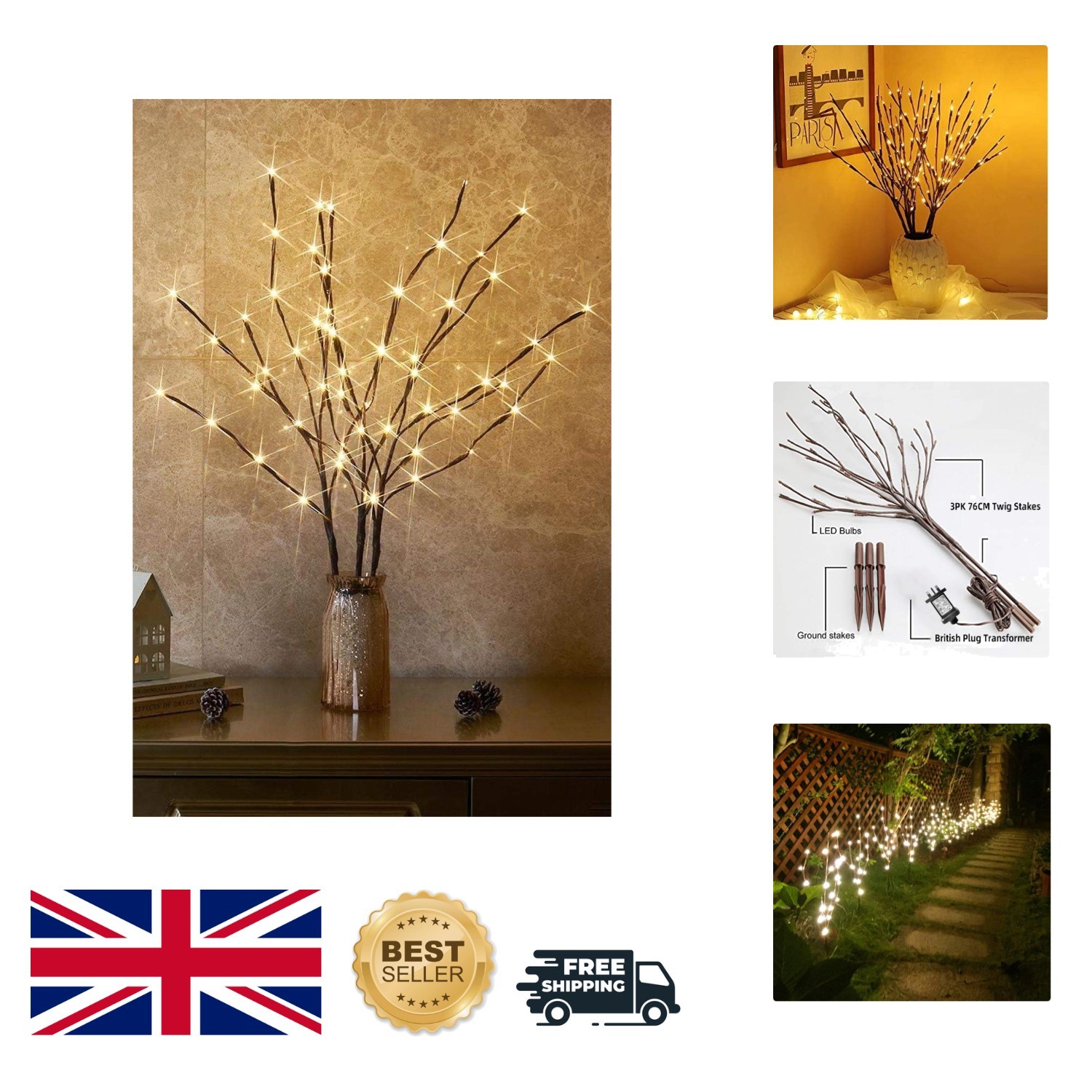 EAMBRITE 3PK 76cm Home Decorative Twig Lights Garden Stake Branch Lights with 60 Warm White LEDs Mains Powered Lighted Branches for Floor Vases Spring Xmas Decor Outdoor and Indoor